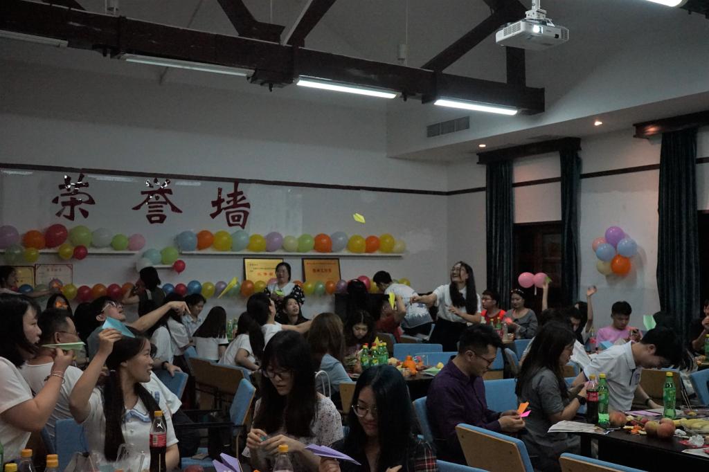 欢声笑语冲淡了离别的悲伤,但盛席终会散场,接着就是茶话会最后一个环节——放飞纸飞机。写满期望与祝福的纸飞机在报告厅上空飞扬,它们穿过那些无忧无虑的校园岁月,落回同学手中时,大家就要各奔前程、各创辉煌。