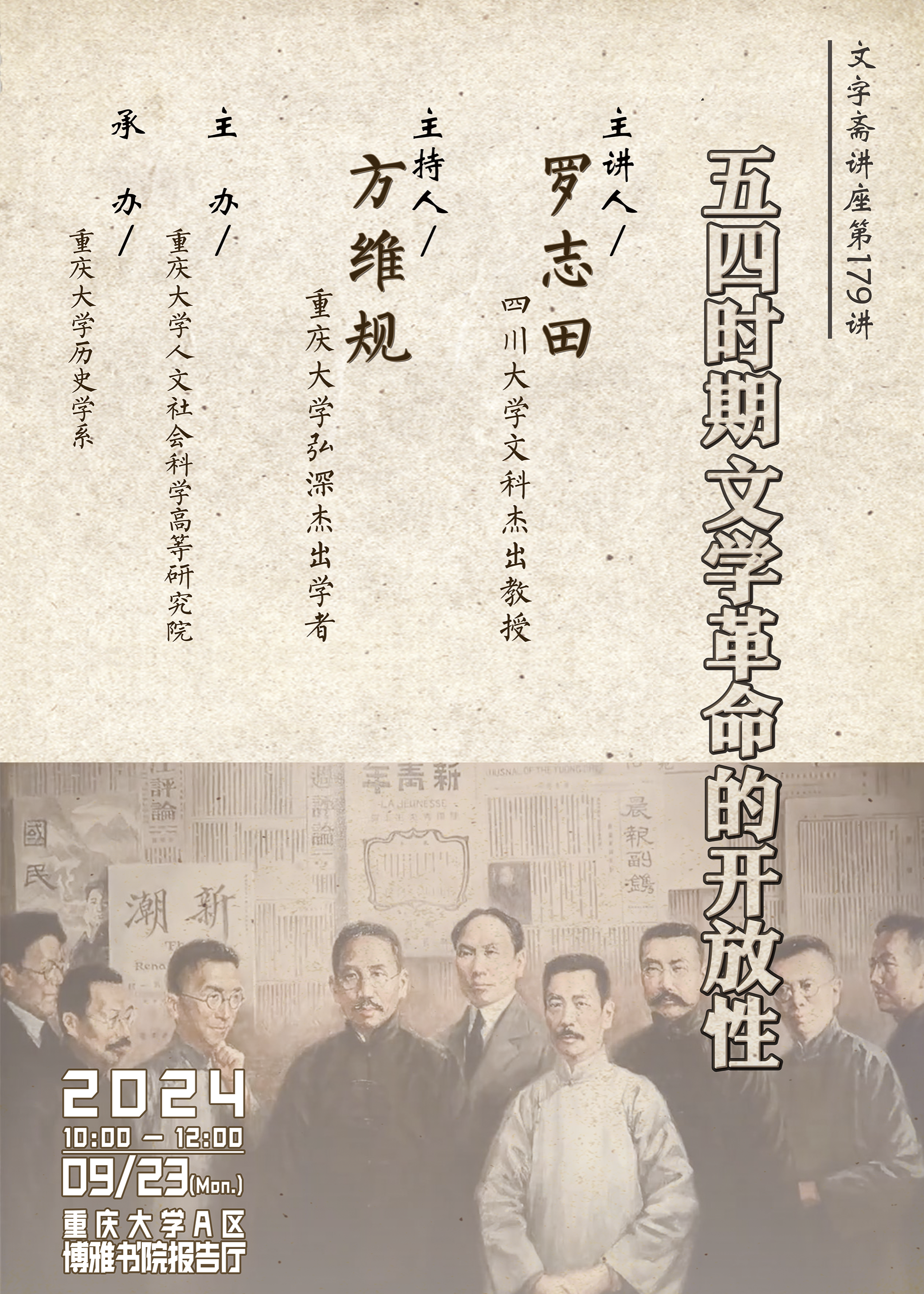 在过去的2024年里,历史学系的学术活动以“少而精”为特色,先后邀请到数位国内相关领域的顶尖学者,为师生们带来场场精彩纷呈的学术盛宴。周勇教授以“重庆史就是中国史、世界史”为题,高屋建瓴地论述了重庆在中国乃至世界历史中的重要地位。周勇教授对重庆历史掌故如数家珍,史料信手拈来,幽默风趣的讲述令人印象深刻。米德昉研究员通过“巴蜀石刻艺术概论”,整体而不失细致地勾勒出巴蜀地区石窟艺术演变的历史脉络,师生们惊叹于巴蜀先民的智慧与艺术造诣。刘永华教授论述“清代东南地区乡里制度的演进路径”,从地方史料切入,由小见大地剖析了明清时期的制度运作与社会生成机制。刘永华教授将讲座主题与其学思历程相结合,娓娓道来,师生们得以领略论题背后的大关切。罗志田教授论“五四时期文学革命的开放性”,从历史的角度重新审视文学革命,别开生面,展现出历史学家的深厚功力与宏阔视野。龙圣教授的讲座“明清大凉山边区传统聚落的形成与演变”,聚焦明清大凉山边区白鹿营水田彝族聚落,将水田彝族自我认同的形成、以及高地族群的生存策略,阐述地入木三分。