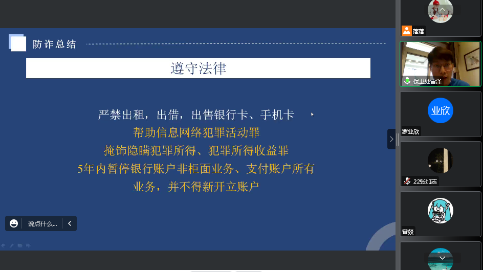 在线上举办了安全教育月反诈知识专题讲座。本场讲座以“平安是最大的智慧”为主题,邀请我校保卫处雷泽老师主讲,由本科生辅导员高宏佳老师主持。学院全体本科生、研究生参与讲座。