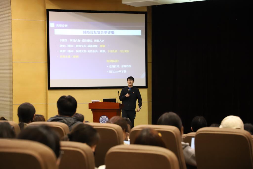 在电信网络诈骗宣讲中,雷老师分析了2022年我校网络诈骗人数和金额,分享实际诈骗案例,揭露了诈骗份子的狡猾和诈骗手段的恶劣,并深入浅出地介绍了目前新型的诈骗类型以及防诈技巧。他表示,学校是诈骗案件的高发区,同学要提高警惕,保护好个人私人信息,提高自我防范能力。