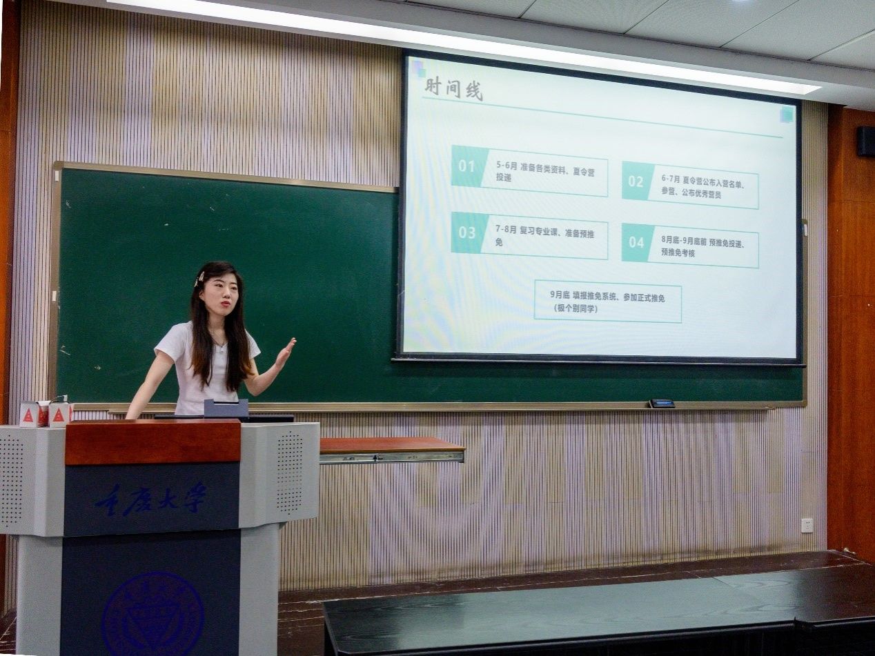 2019级哲学专业郭树莹和2019级法学专业黄经宸针对推免研究生相关内容展开分享。两位同学详细介绍了推免研究生的一般流程和具体事务,从夏令营申请、面试准备、专业课复习、英语口语等角度进行具体阐述。并从文学、史学、哲学、法学四个专业分类进行介绍,详细解读每个专业侧重点,从申请学校特点、往届情况、个人推免资格获得等角度给大家分享了实用有效的建议。