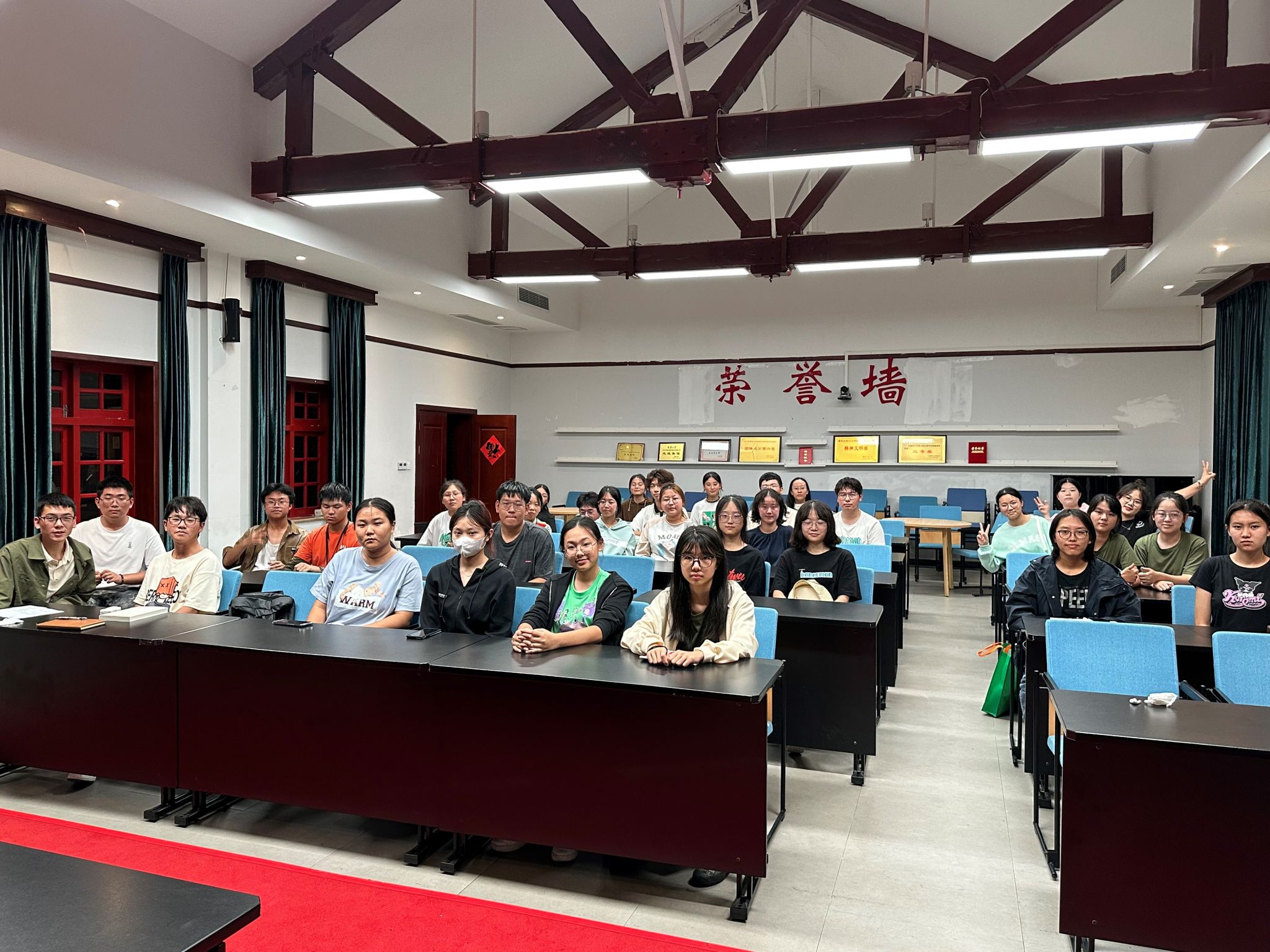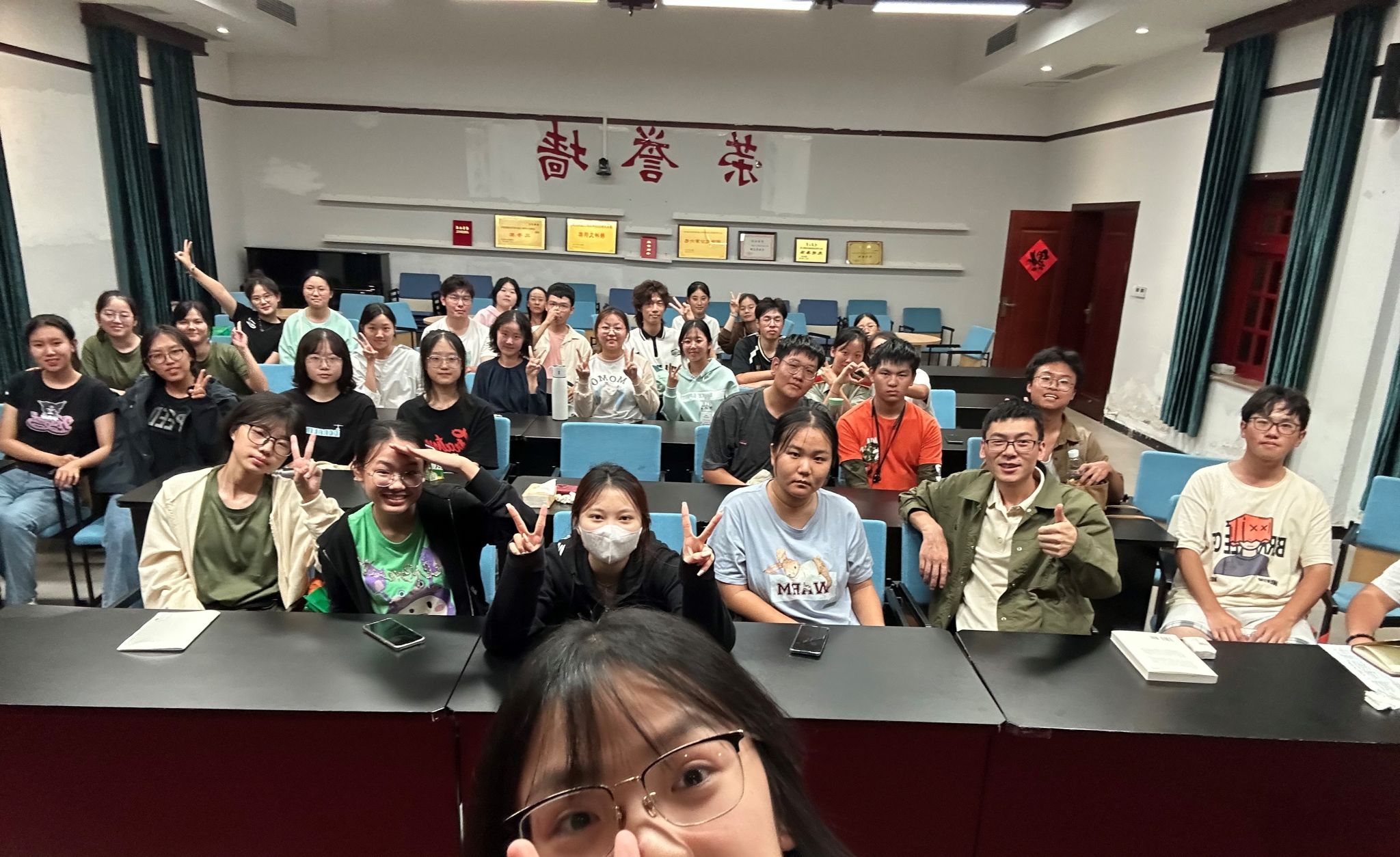 2023级1班在博雅小院报告厅开展了“新开端,新生活”的主题班会,班主任赵耀文和全班同学参加。
