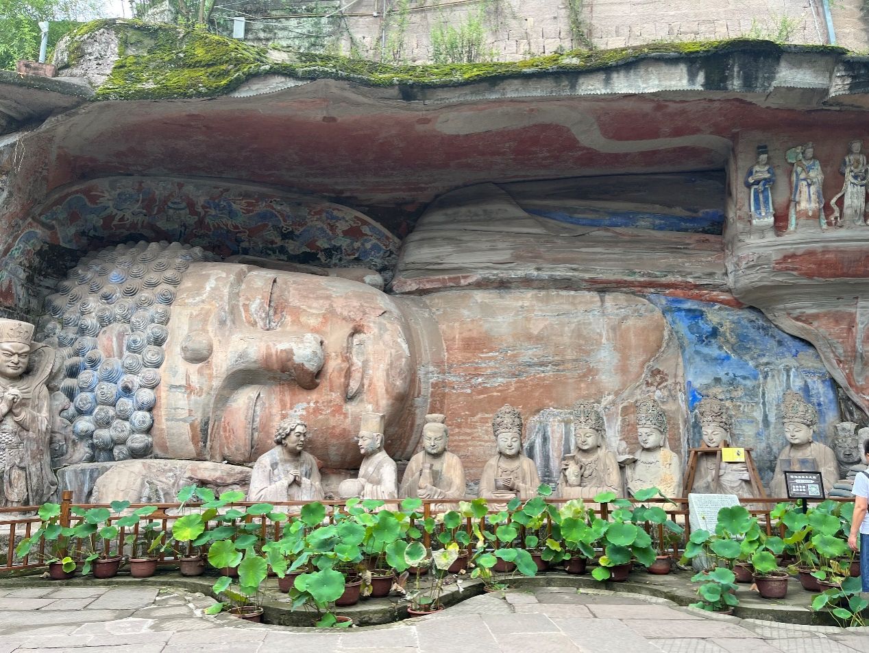 其中,宝顶山镇山之宝——千手观音像和大足石刻最大的卧佛——释迦摩尼涅槃圣迹图给同学们留下了深刻的印象。千手观音像是宋代工匠在88平米的石壁上为观音雕刻出了1007只形态各异的手,手掌中心刻画了眼睛与各类法器,千手千眼代表着观音的法力无边与智慧无穷。而卧佛则通过半身雕刻的方法,体现其“无穷大”的内涵。卧佛四周的水沟,不仅是九曲黄河的象征,也提供了排水的便利,与此功用相似的九龙浴太子图位于其左侧,而最左侧的孔雀大明王图则展现了孔雀明王保平安的能力。