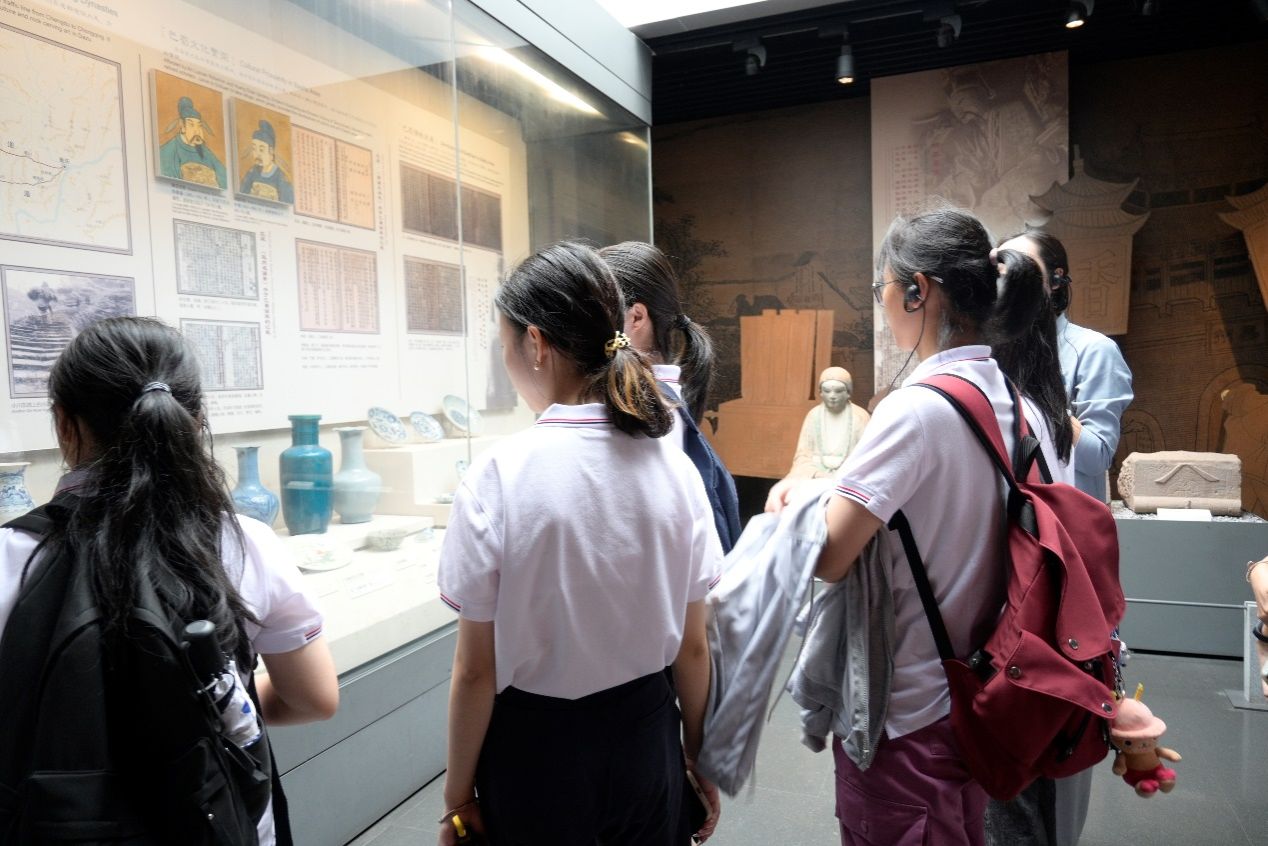 同学们分为三组,在讲解员的带领下乘坐观光车前往大足石刻博物馆。在馆中,讲解员向同学们展示了利用3D测绘技术制作的大足石刻著名雕像的数字影像,讲解了沙盘中所展示的景区内宝顶山、北山、南山、石门山、石篆山,即“五山”的各自特征,帮助同学们形成对大足石刻的整体印象。
