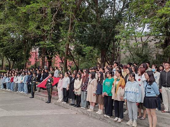 在国旗护卫队整齐的步伐下升旗仪式正式开始。国歌响起,同学们庄严肃立,唱响《义勇军进行曲》,歌声嘹亮,饱含敬仰。随后进行国旗下朗诵活动,2023级本科生姚荣增、何潇栩、包慧茹作为学生代表在国旗下朗诵诗歌《英魂永存》,清明将至,英烈当缅,三位同学以饱满的热情诵出自己对先烈的缅怀与崇敬。最后,活动以师生一起在国旗下进行合影而结束。