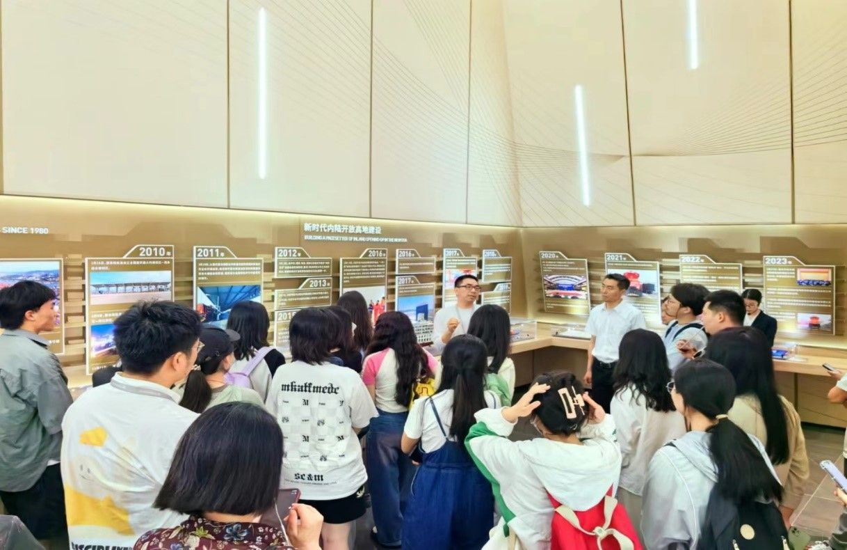 本次实践活动主要包括展厅参观、VR实景体验、聆听讲座及交流座谈四个部分。进入园区后,师生漫步展厅,共同追溯“渝城记忆”,真实触摸园区发展历史脉络;通过VR等前沿技术的高效运用,在实景体验中跟随货物流通路线“走向全球”,感受系统科学的物流网络在战略性互联互通中的核心作用。