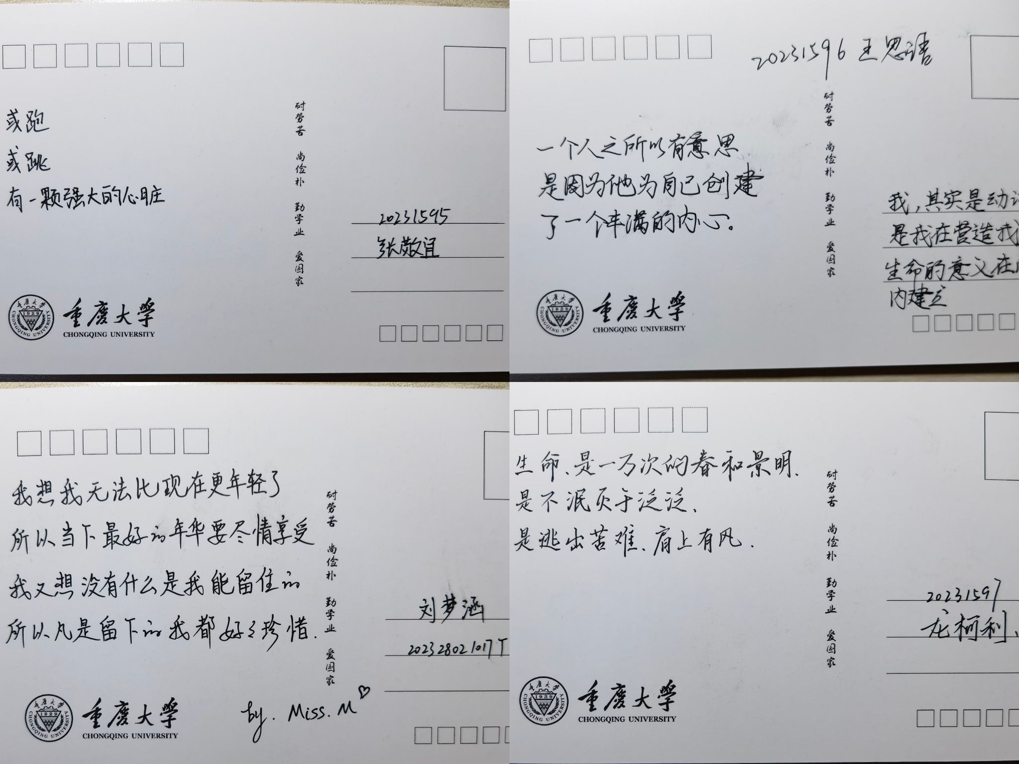 在同学们的热情参与和大力支持下,活动共持续五个小时,收取明信片数百张,经过筛选部分明信片内容展示如下:“生命是一万次的春和景明,是不泯灭于泛泛,是逃出苦难,肩上有风”“或跑,或跳,或有一颗强大的心脏”“我想我无法比现在更年轻了,所以当下最好的年华要尽情享受;我又想没有什么是我能留住的,所以凡是留下的我都好好珍惜”“心里的火永远不要灭,哪怕别人只能看到烟,坚持你的热爱,奔赴下一场灿烂”“予我欢笑,予我苦难,无数次的重组蜕变,只为洞见真我,只为邂逅体验”等来自同学们内心深处的诗意话语,表达了大家对生命、对未来的无限期许。