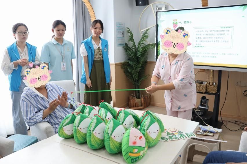 “有趣的端午习俗”环节将本次活动推向了高潮。趣味益智的“钓粽子”游戏吸引了患者们的积极参与,引发阵阵欢声笑语,台上参与者的专注与台下的欢呼鼓励交相呼应。在“手作香囊”过程中,志愿者和医院社工通力合作,根据香囊图纸一对一指导患者制作艾草香囊,并详细讲解了注意事项。小小的香囊既凝聚着传统中医的深厚智慧,也承载着人们对安全与健康的美好追求。完成香囊制作后,每个人手持自己的手工作品,脸上洋溢着发自内心的笑容,本次活动在大家的欢声笑语中落下了帷幕。