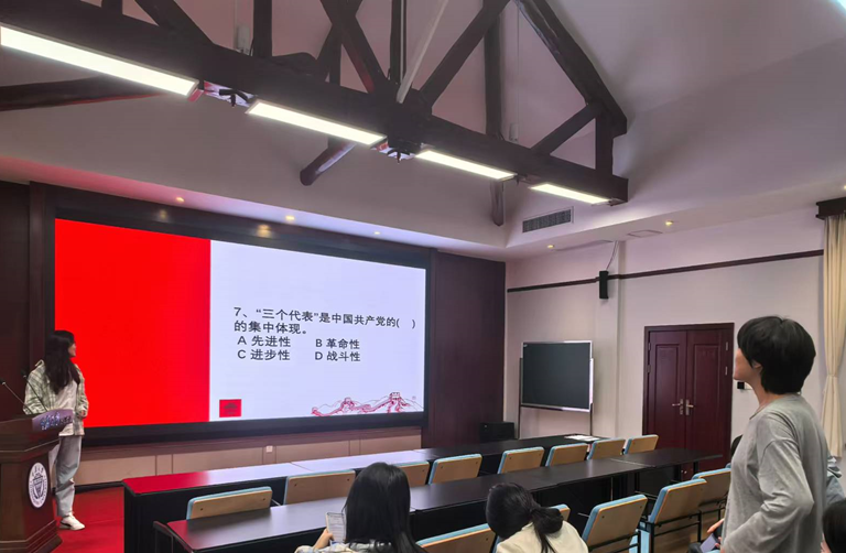 多样形式展风采,激发学习新活力。在理论学习的基础上,各支部还设计了多样的互动环节,充分调动大家学习的积极性。2024级团支部设计了知识竞赛环节与宣誓环节。充满趣味性的知识竞赛让同学们在问答之中,进一步加深了对习近平新时代中国特色社会主义思想和党的二十届三中全会精神的认知和理解。庄重的宣誓环节激励着团员铭记责任与使命,将个人理想与国家发展、民族复兴相结合。