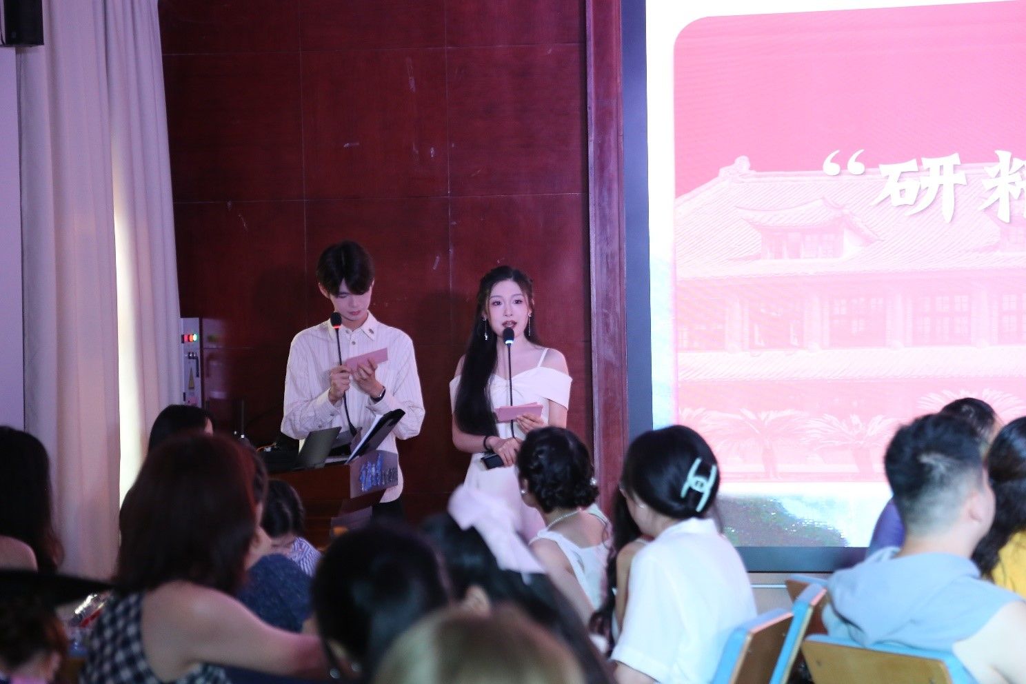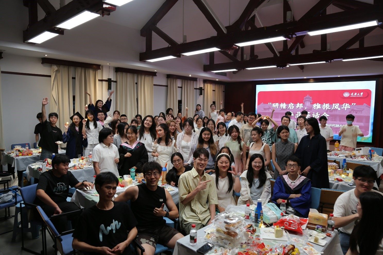 下午6点,师生们齐聚博雅书院报告厅,开始温馨茶话会。大屏幕播放的毕业生成长VCR唤醒无数共同记忆;程可苒、方刘国同学演唱的《二十二》烘托出温馨氛围。学院孙江林书记关切提醒毕业生直面未来挑战,学会调适心境;唐杰副院长回顾博雅教育初心,强调“全人”素养是应对不确定性的宝贵财富,并送上诚挚祝福。