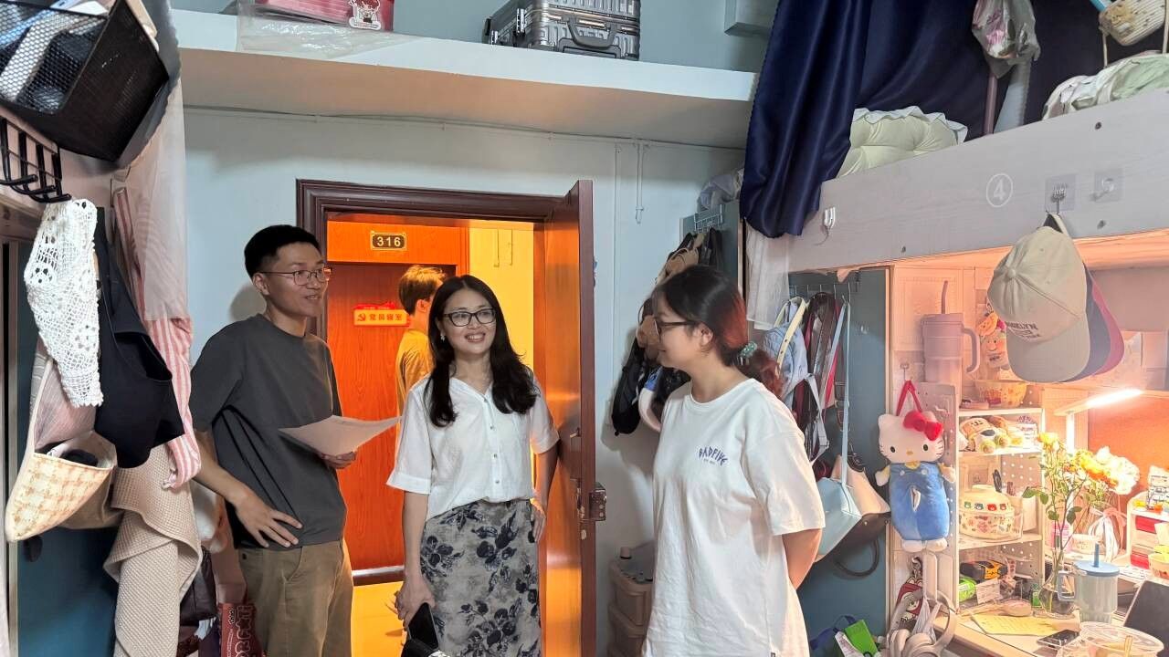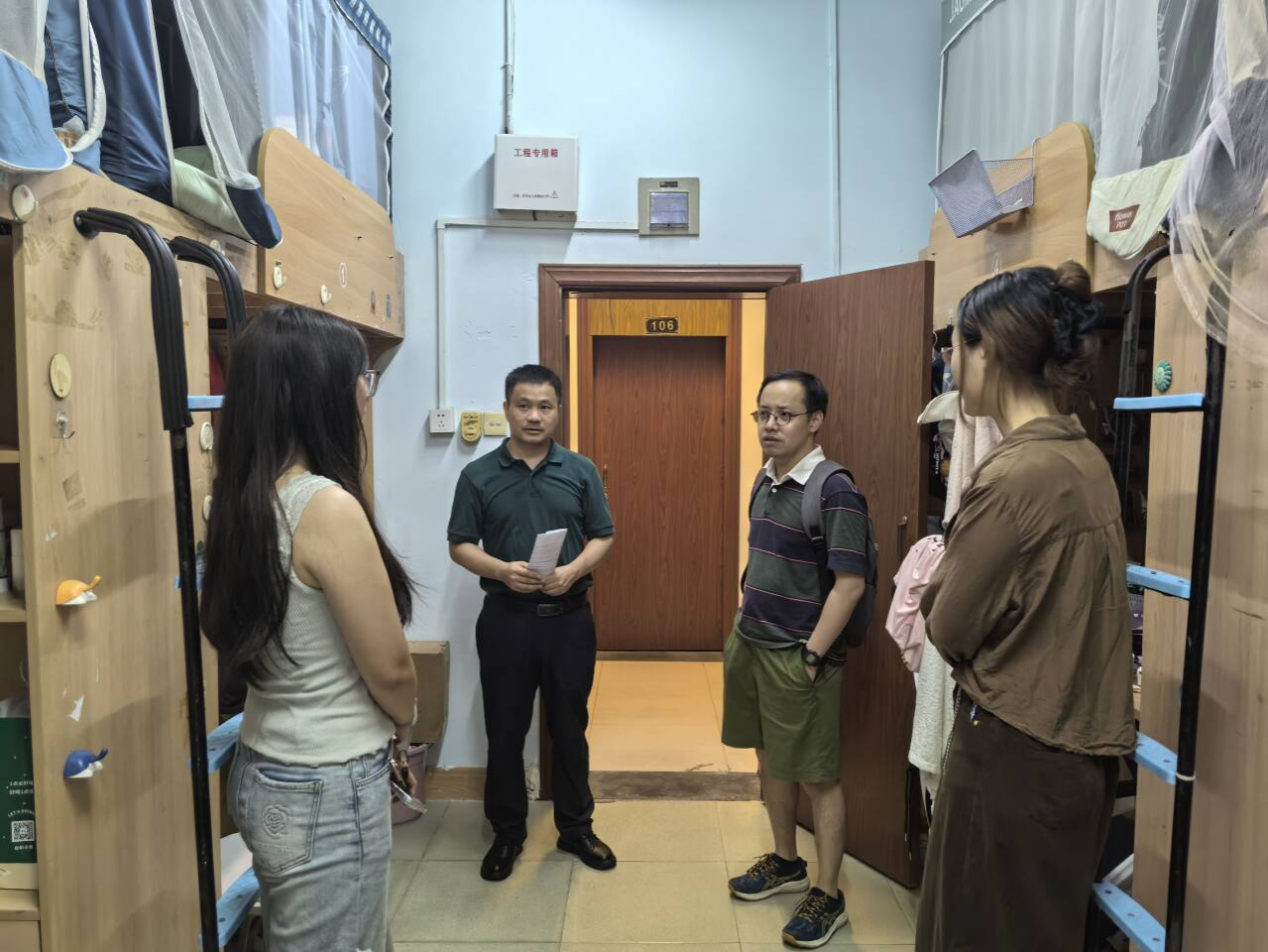在随后的走访中,检查人员分组深入学生宿舍,详细了解同学们的学习生活状况,认真检查卫生环境和用电安全,并对存在的问题提出整改意见。走访过程中师生交流融洽,气氛温馨。针对即将到来的“双节”假期,检查组重点强调了假期安全事项,特别提醒学生注意交通出行、用电防火等安全问题。结合近期多发的电信网络诈骗案例,老师们现场开展防诈骗宣传,提醒学生增强防范意识,确保人身和财产安全。