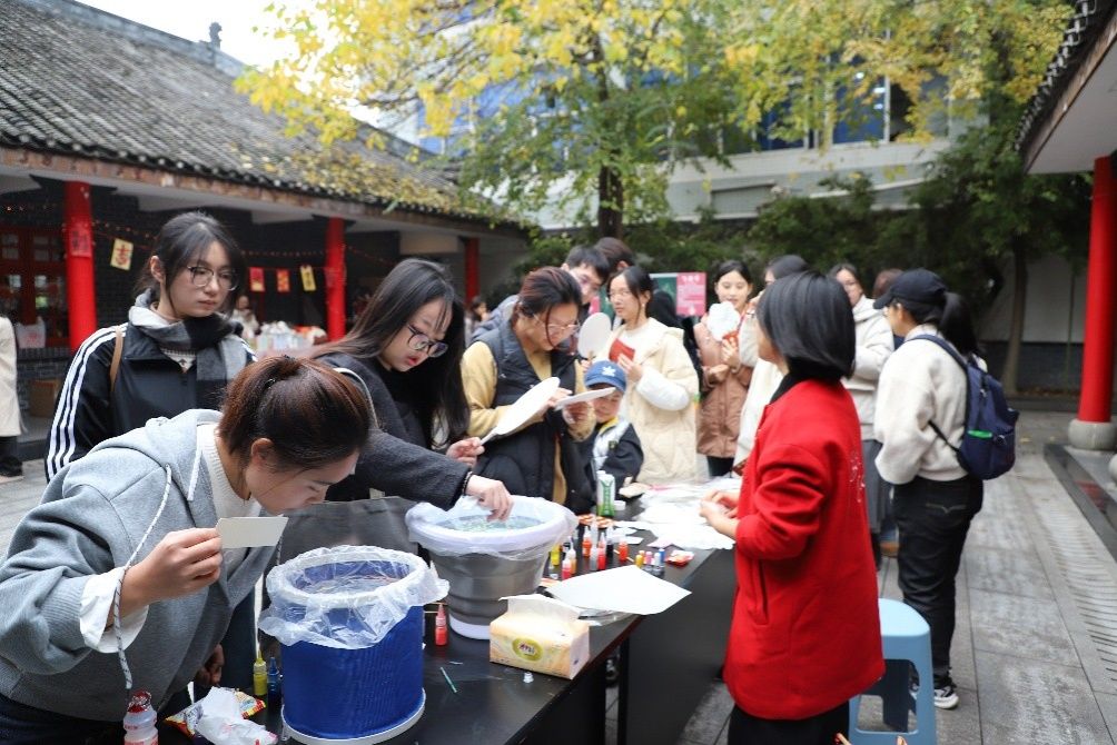 户外游园区设置多个传统文化体验与团队互动项目。“同心协力运球赛”考验团队默契,“诗词飞花令”吸引众多古典文学爱好者参与交流。“漆染扇面”手工区尤为受欢迎,同学们在素白扇面上绘制个性图案,体验传统工艺之美。现场师生穿梭于各展位之间,参与游戏、交流互动,在冬日的暖阳与欢笑中共度美好时光。