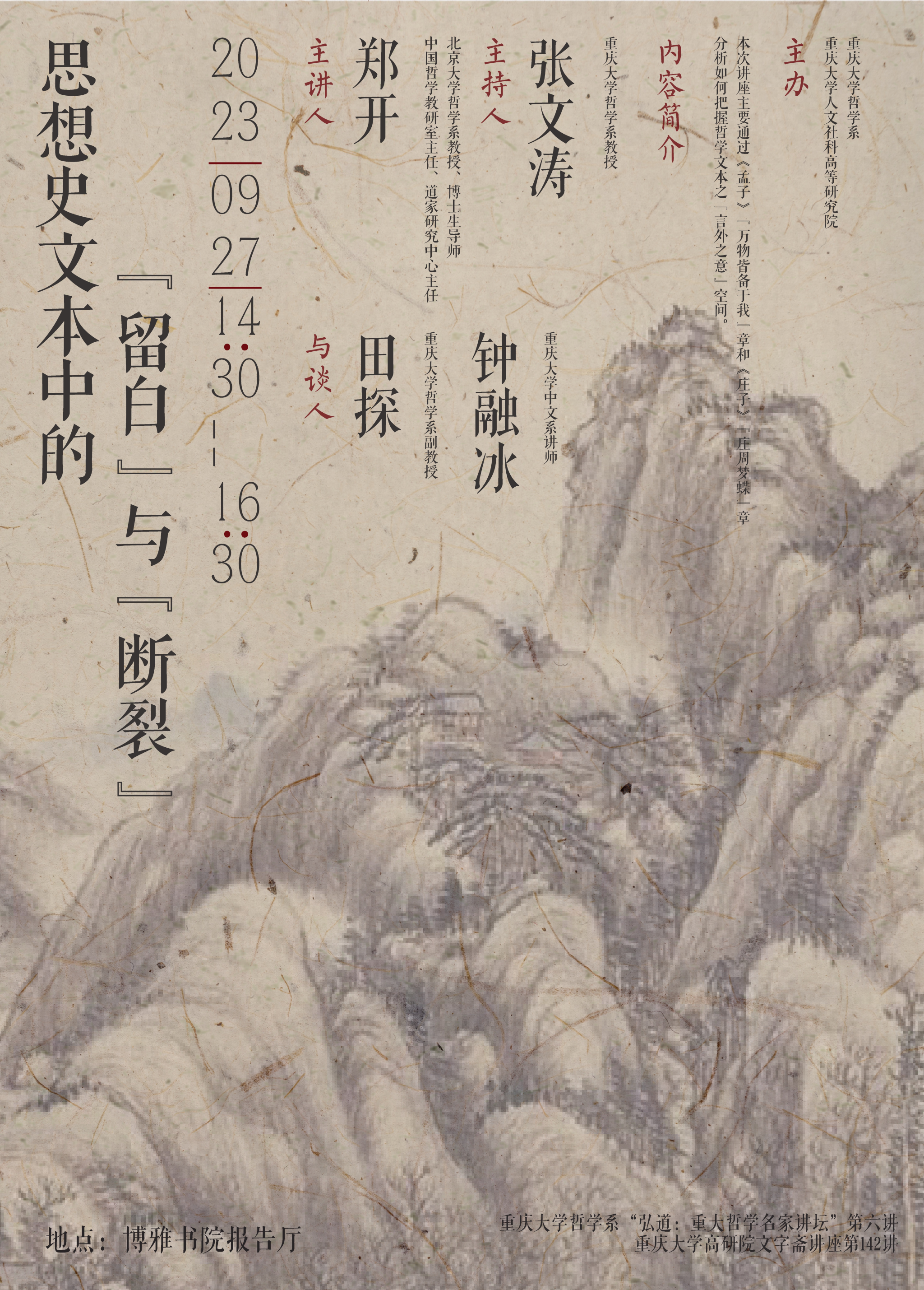 中国先秦前哲学时期的思想文献(例如六艺和史册)皆具官方文档的特点,似乎可以概括为“辞”,而哲学发端时期的《老子》《论语》则颇具“语”的特点,而《孟子》《庄子》为代表的哲学进一步突破时期的文本形式已经具有了“论”的性质。本次讲座“思想史文本中的‘留白’与‘断裂’:兼论语境主义方法论”,主要通过《孟子》“万物皆备于我”章和《庄子》“庄周梦蝶”章,分析如何把握哲学文本之“言外之意”。