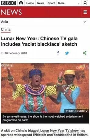 //cn.nytimes.com/china/20180222/china-africa-blackface-lunar-new-year/;法国RFI,见//www.rfi.fr/cn/中国/20180216-涂黑脸垫屁股扮非洲大妈春晚小品被轰种族歧视;等等。