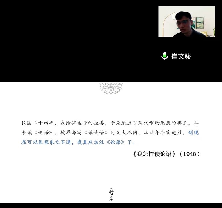 中文系新一期的学术沙龙在线上召开,“博士论文奖学金”访问学者、南京大学文学院博士候选人崔文骏作了主题为《“信而好古”与“微言大义”——废名与<论语>的三种读法》的学术报告。