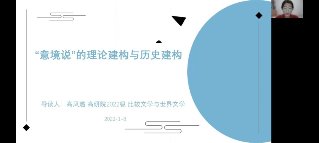 2023年1月8日晚,久久小说 批评理论与批评史研究中心师生在线上成功举办了第一期第三次读书会。本次读书会的主题是“传统的断裂或重生”,主要围绕罗钢教授《传统的幻象:跨文化语境中的王国维诗学》的第九章至余论部分进行研讨,对王国维的境界说的建构、中西诗学观念对读等问题进行了深入研讨和交流。本次读书会由批评理论与批评史研究中心主任金浪教授主讲,中心成员石磊老师、斯维老师、张振老师,中文系古代文学方向吴娇老师以及中文系的十余名硕士生和本科生参加了读书会。