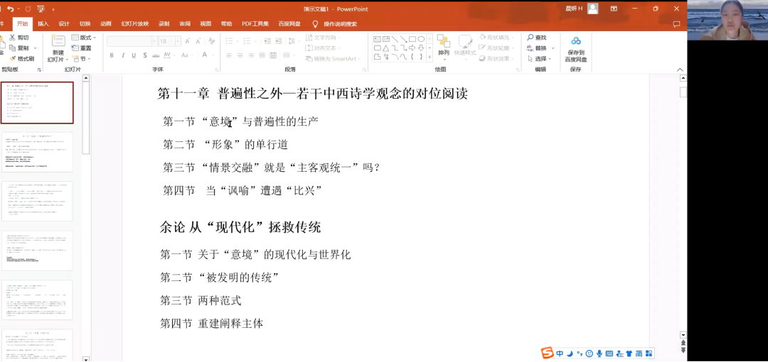 韩晨妍同学从衍指符号概念入手对第十一章和余论进行了导读。她认为第十一章核心在于指出“意境”/“境界”作为衍指符号,遮掩了其思想上的外来性质,使得王国维在与常州词派的对话中更容易受到后者的认可。罗著运用对位阅读,分别围绕典型与意境、image与意象、主客观统一与情景交融、讽喻与比兴展开辨析,不仅指出根植于德国哲学的王国维诗学与中国传统诗学之间的差异,也揭示了在跨文化诗学中隐藏的西方文化霸权对中国诗学传统的挑战。而余论部分则聚焦中国当代学术界在面对跨文化诗学问题上时的“失语”困境,深刻地指出在中国古代文论进行现代转化命题的背后,存在着中国古代文论术语经过“自我阉割”而成为空洞能指、成为被偷梁换柱的衍指符号的危险。罗钢教授提示,应当警惕回归传统的主观意愿反使得真正的传统被失落这一悖论性的状况,并由此指出在通往中国古代诗学传统的道路上,中国学者可能需要打破“传统”的幻象,重新出发。