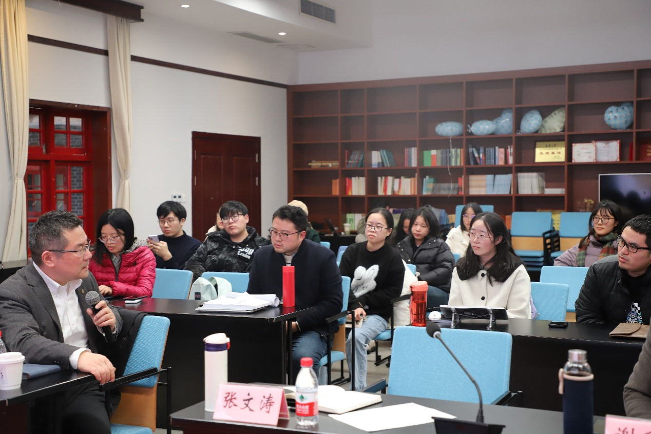 哲学系张文涛教授主持,谢利民副教授、朱成明副教授、董成龙副教授与谈,学院数十名师生参与研讨交流。