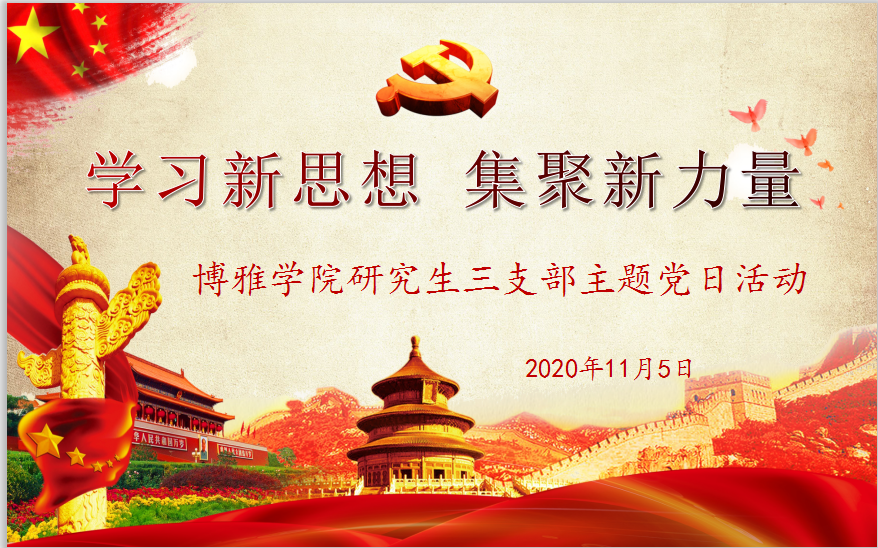 近日,中国共产党第十九届中央委员会第五次全体会议在北京胜利举行。为深入贯彻党的十九届五中全会精神,充分认识党的十九届五中全会的重大意义,并进一步深化支部党员、发展对象及入党积极分子的思想理论学习,提升思想觉悟。2020年11月5日下午,研究生三支部开展了主题为“学习新思想,集聚新力量”的主题党日活动,本次活动由党支部组织委员姚富耀同志主持,三支部的全体党员、发展对象及入党积极分子参加。
