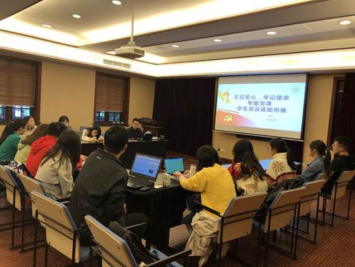 党委副书记胡佳老师在文字斋报告厅为学院全体本科生党员、发展对象以及入党积极分子讲了一堂内容丰富的党课,主题为“不忘初心、牢记使命,学生党员该如何做”,全体参与同志认真聆听,积极互动。
