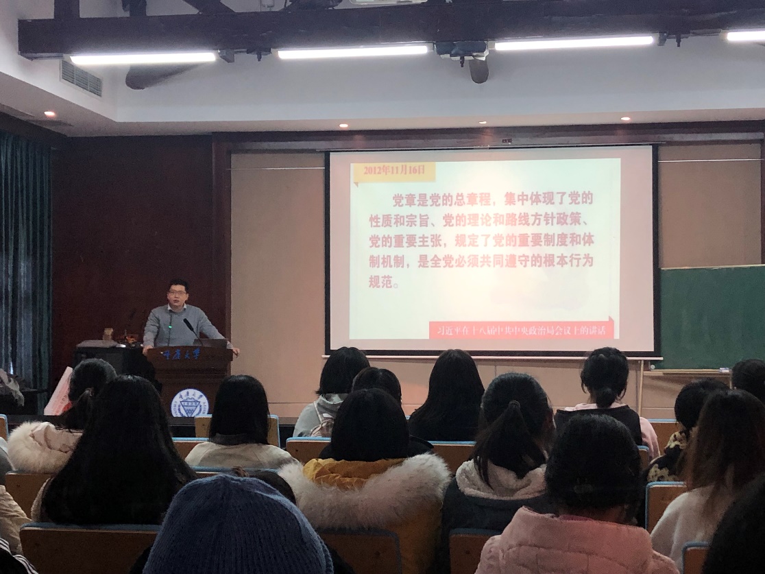 青年教师党员钟融冰同志结合第一次党章学习内容,从端正同学们入党动机出发,介绍了党的性质、宗旨、最高理想和最终目标。