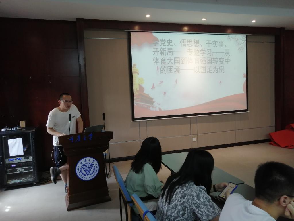 会议第一项为“从体育大国到体育强国的转变”主题学习,由陈雪柯和白云安两位同志主讲。陈雪柯主讲主题为“从体育大国到体育强国的转变:深入学习贯彻新时代习近平关于体育的重要论述”。白云安主讲的主题是“从体育大国到体育强国转变中的困境——以国足为例”。白云安从历史、前景、党政方针、足球运动的重要性、目标、问题方案几个方面进行了讲解。