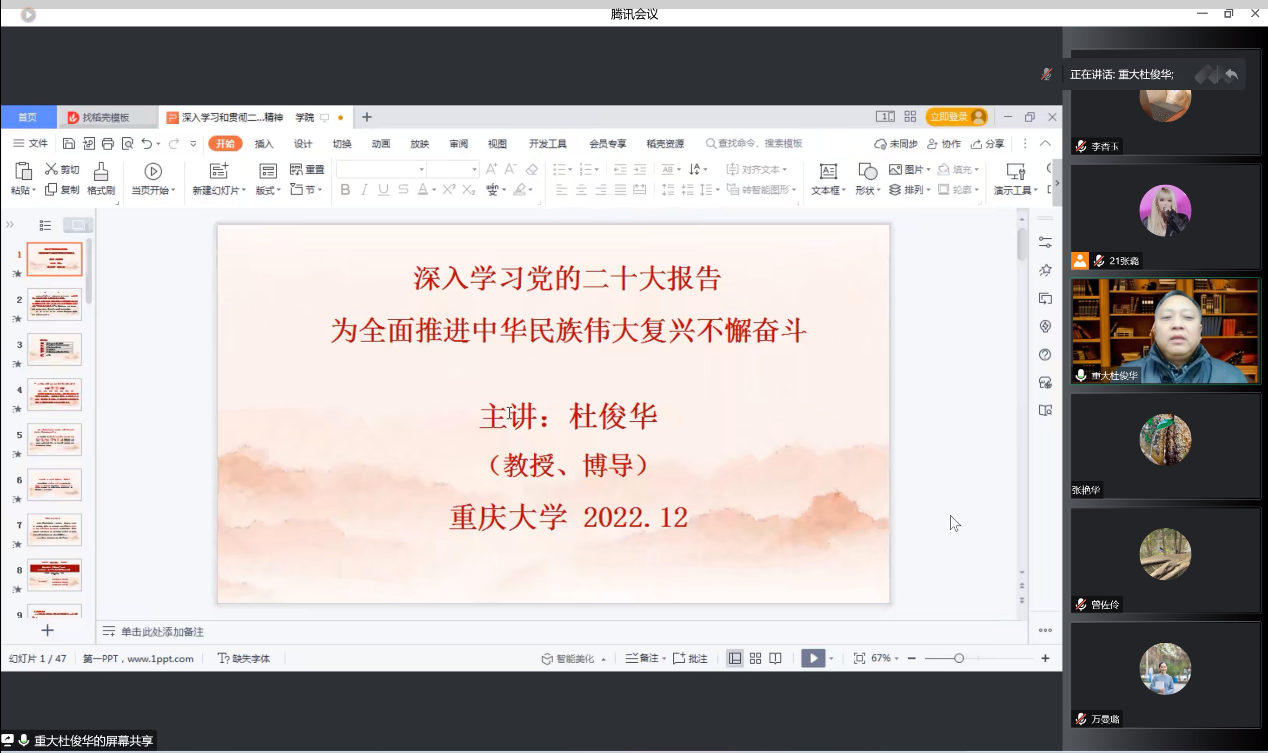 会上,杜俊华教授从党的二十大的主题、主要成果、过去五年的工作和新时代十年的伟大变革、马克思主义中国化时代化、中国式现代化、全面建设社会主义现代化国家的目标任务和应对风险等七个方面对党的二十大精神进行了深入解读。杜俊华教授强调我们要紧密团结在以习近平同志为核心的党中央周围,高举中国特色社会主义伟大旗帜,全面贯彻习近平新时代中国特色社会主义思想,牢记空谈误国、实干兴邦,坚定信心、同心同德,埋头苦干、奋勇前进,为全面建设社会主义现代化国家、全面推进中华民族伟大复兴而团结奋斗!