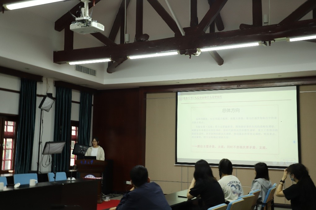为将调查研究中的经验与新文科建设相结合,提高将调查研究成果转化为具体工作举措的能力。汇报人王玥结合东升村的田野调查经历,分享了自己的学习心得。王玥文指出调查是党的谋事之基、成事之道,是获得真理的源头活水,应当知行合一,落实文件精神,并且与人文社科相结合,做好人文社科研究。