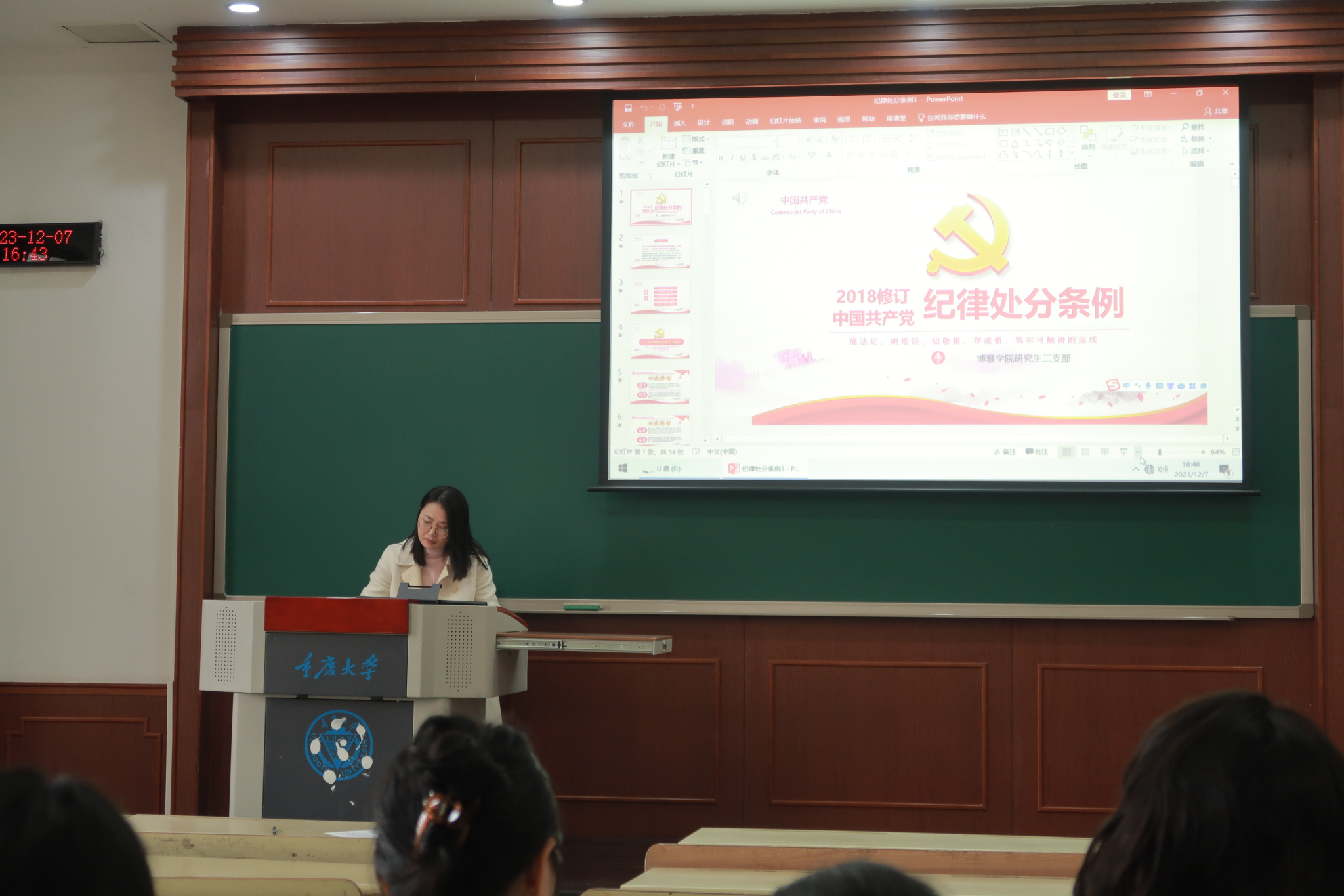 严守纪律不逾矩 风清气正促发展。修订实施《中国共产党纪律处分条例》(以下简称《条例》),是坚持党要管党、从严治党,坚持依规依纪治党的一项重大战略举措,既是为全体党员制定的行为规范,也是向全国人民做出的庄严承诺。严明纪律是我们党不断从胜利走向胜利的重要保障。为深刻思考领会《条例》精神,做到内化于心、外化于行,支部书记郑家勤同志于12月7日下午带领支部全体成员学习《条例》。郑家勤同志从《条例》的修改原因、修订内容、新《条例》的重点、执行办法和违反新《新条例》的典型案例几方面展开讲解,有效加深了支部成员对《条例》的精神实质和具体规定的认识理解,为《条例》的贯彻执行打牢了良好的思想基础。