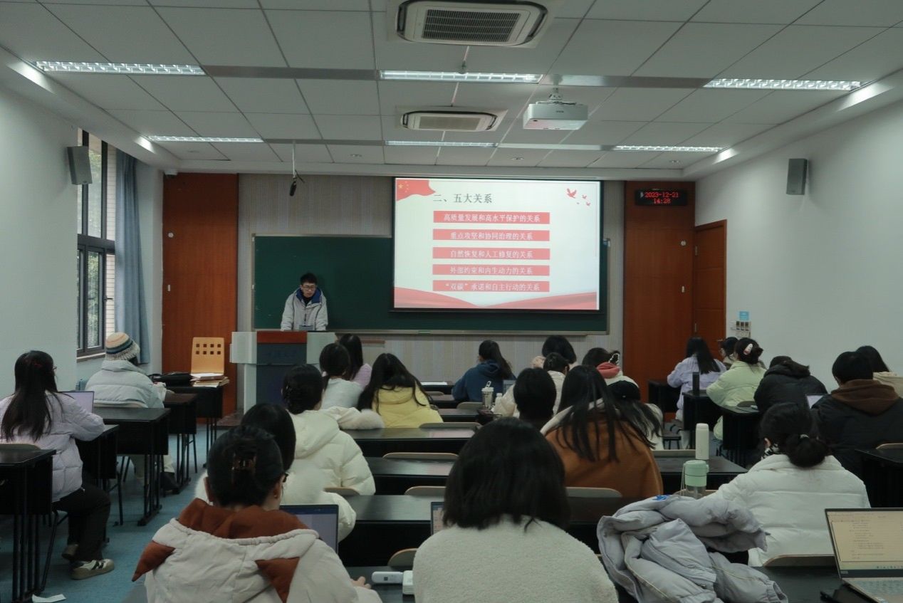 处理生态文明建设的几个重大关系,实现人与自然和谐共生的现代化。“总结新时代十年的实践经验,分析当前面临的新情况新问题,继续推进生态文明建设,必须以新时代中国特色社会主义生态文明思想为指导,正确处理几个重大关系。”在全国生态环境保护大会上,习近平总书记深刻阐述了新征程上推进生态文明建设需要处理好的五个重大关系,充分体现了马克思主义唯物辩证的思想方法,是我们党对生态文明建设规律性认识的进一步深化。为深刻领悟习近平总书记的重要讲话,支部全体成员于12月21日下午开展对《推进生态文明建设需要处理好几个重大关系》的学习,由刘小平同志领学。刘小平同志从高质量发展和高水平保护的关系、重点攻坚和协同治理的关系、自然恢复和人工修复的关系、外部约束和内生动力的关系和“双碳”承诺和自主行动的关系几个重大关系展开解读,使同志们深刻认识到中国式现代化是人与自然和谐共生的现代化,尊重自然、顺应自然、保护自然是全面建设社会主义现代化国家的内在要求。