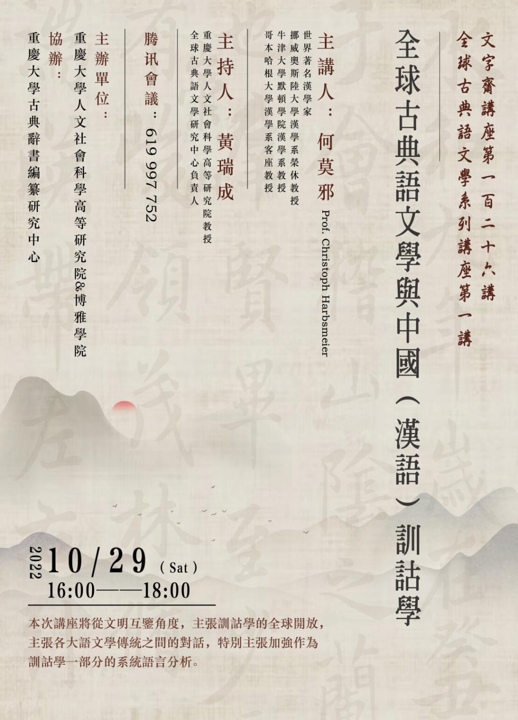 中国(汉语)训诂学有伟大的传统,值得向更广泛的全球语文学界介绍。本次讲座将从文明互鉴角度,主张训诂学的全球开放,主张各大语文学传统之间的对话,特别主张加强作为训诂学一部分的系统语言分析。讲座将以何莫邪教授所主持的持续建设已35年的项目“汉学文典”为例,展示我们可以如何推进全球化和系统化的分析训诂学,并主张全球化的训诂学要尊重世界上许多伟大学术传统的多元性。