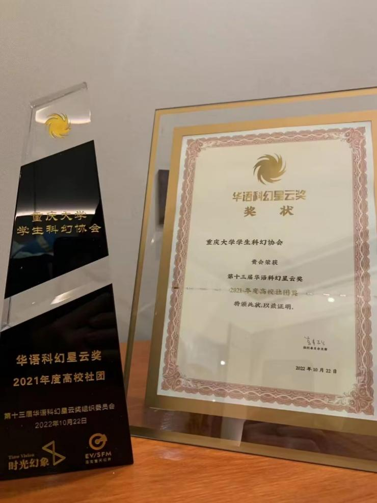 第十三届“华语科幻星云奖年度高校社团”奖状与奖杯