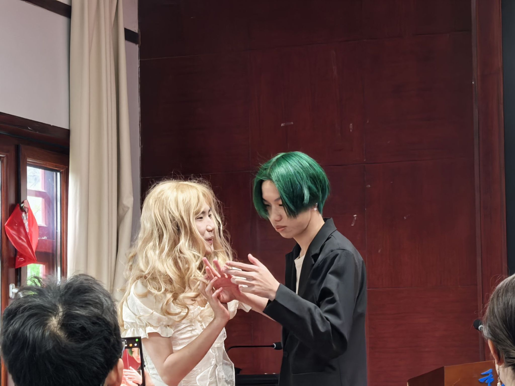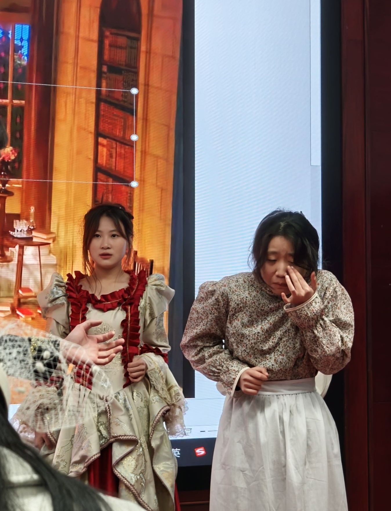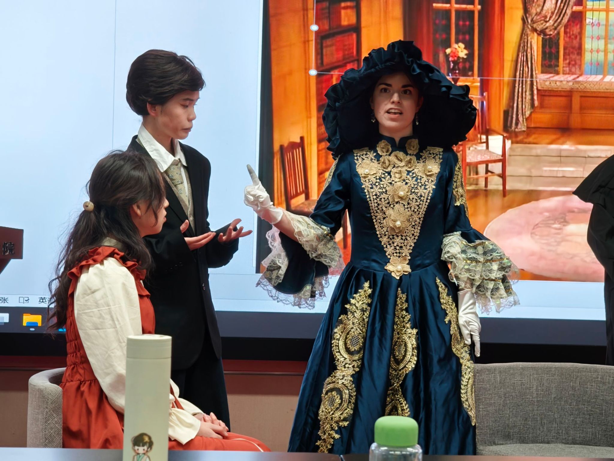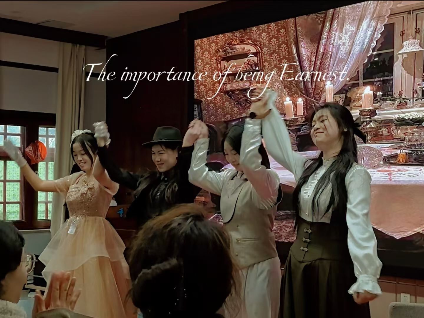 在主持人费璐思和曹铭轩同学的精彩开场后,演员们身着戏服依次登场,举手投足间仿佛真正的舞台剧演员,风度翩翩而又不失幽默。演员们个个熟读文本,英文台词流利,情感丰沛,俨然已进入角色内心。英伦绅士的放浪不羁、维多利亚贵族小姐的傲慢被演绎得生动形象,爱情的火花、身世的秘密、结尾的反转在舞台上淋漓尽致地呈现,引发了观众阵阵喝彩。